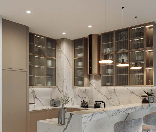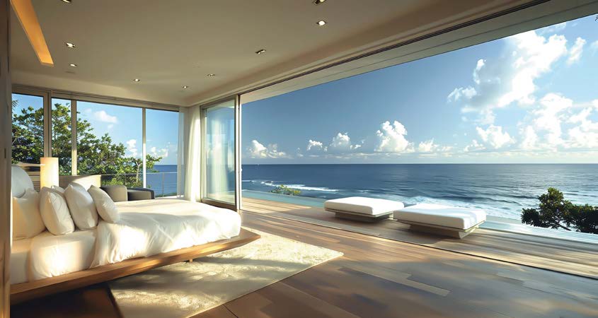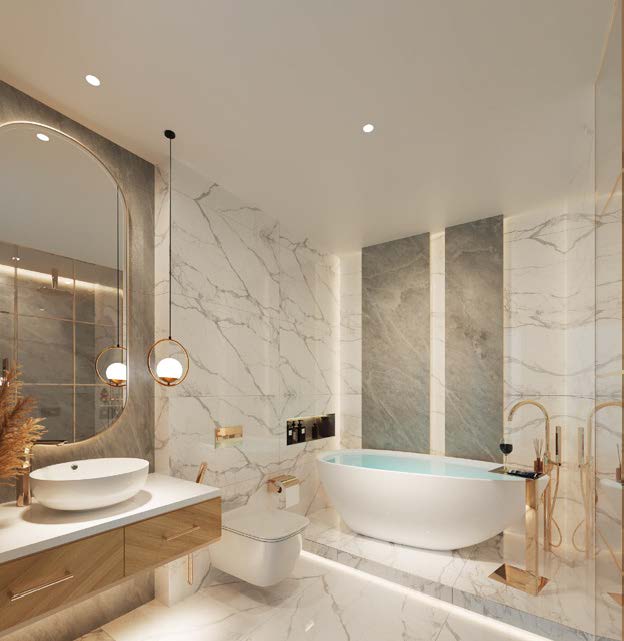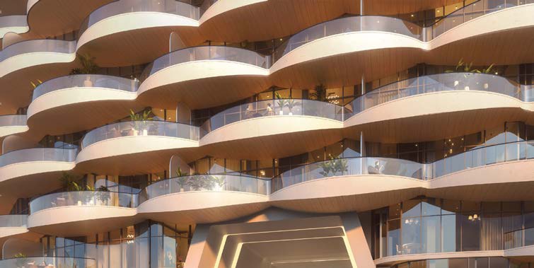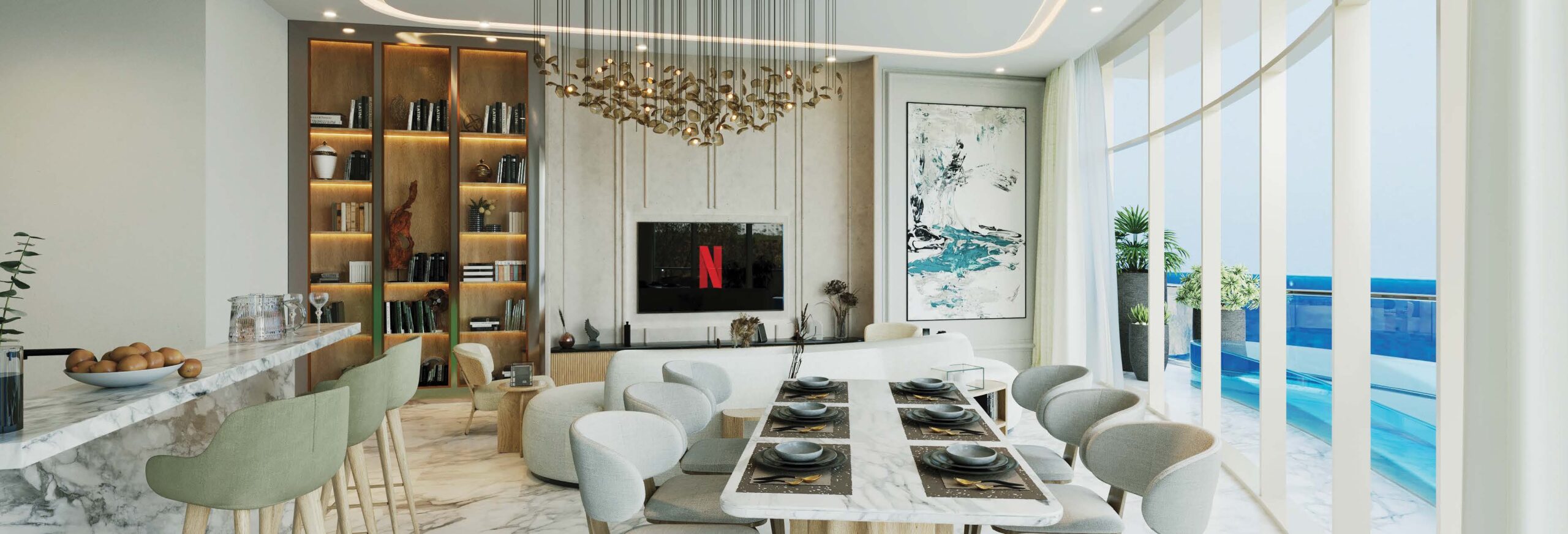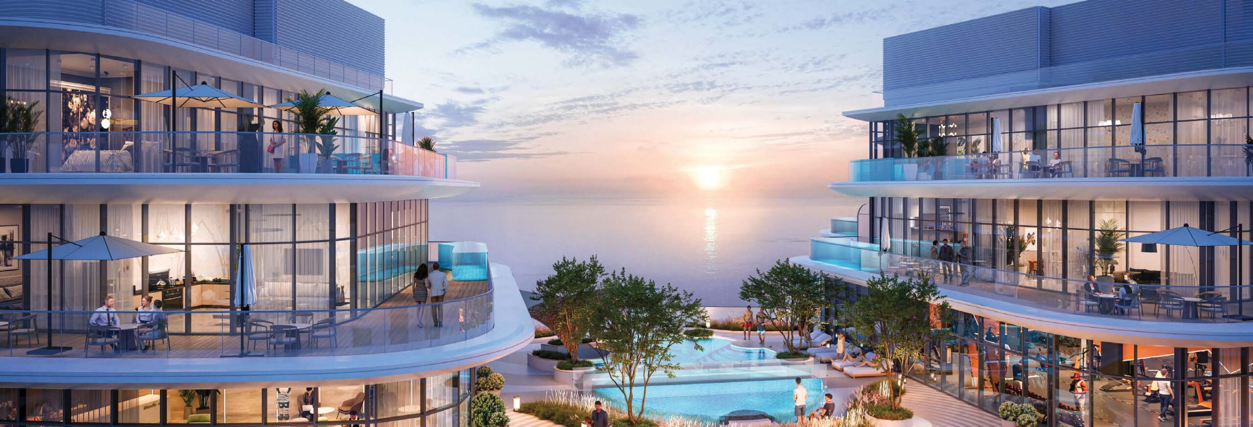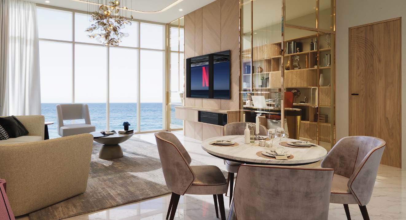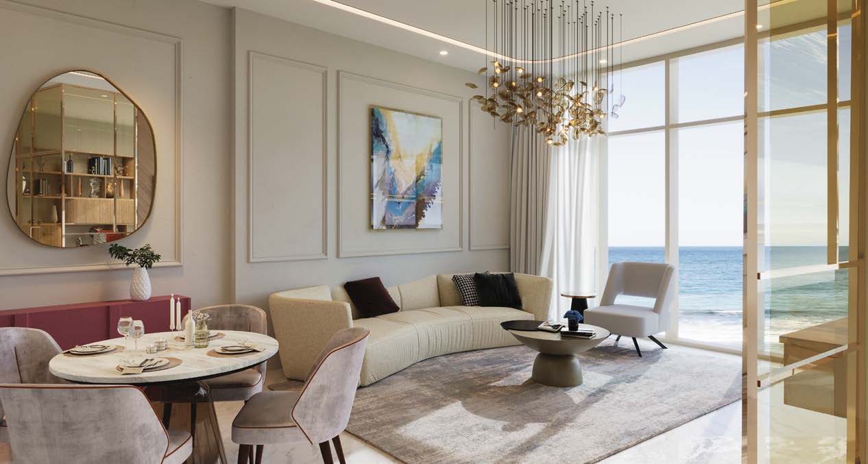 Die Residenzen überzeugen durch großzügige Grundrisse, bodentiefe Fenster, hochwertige Materialwahl und Meerblick, der den Charakter des Projekts prägt. Die Bewohner profitieren von erstklassigen Amenities wie Infinity-Pool, Fitnesslounge, Spa-Bereichen, Grünzonen, Concierge-Service und privatem Zugang zur Strandpromenade.