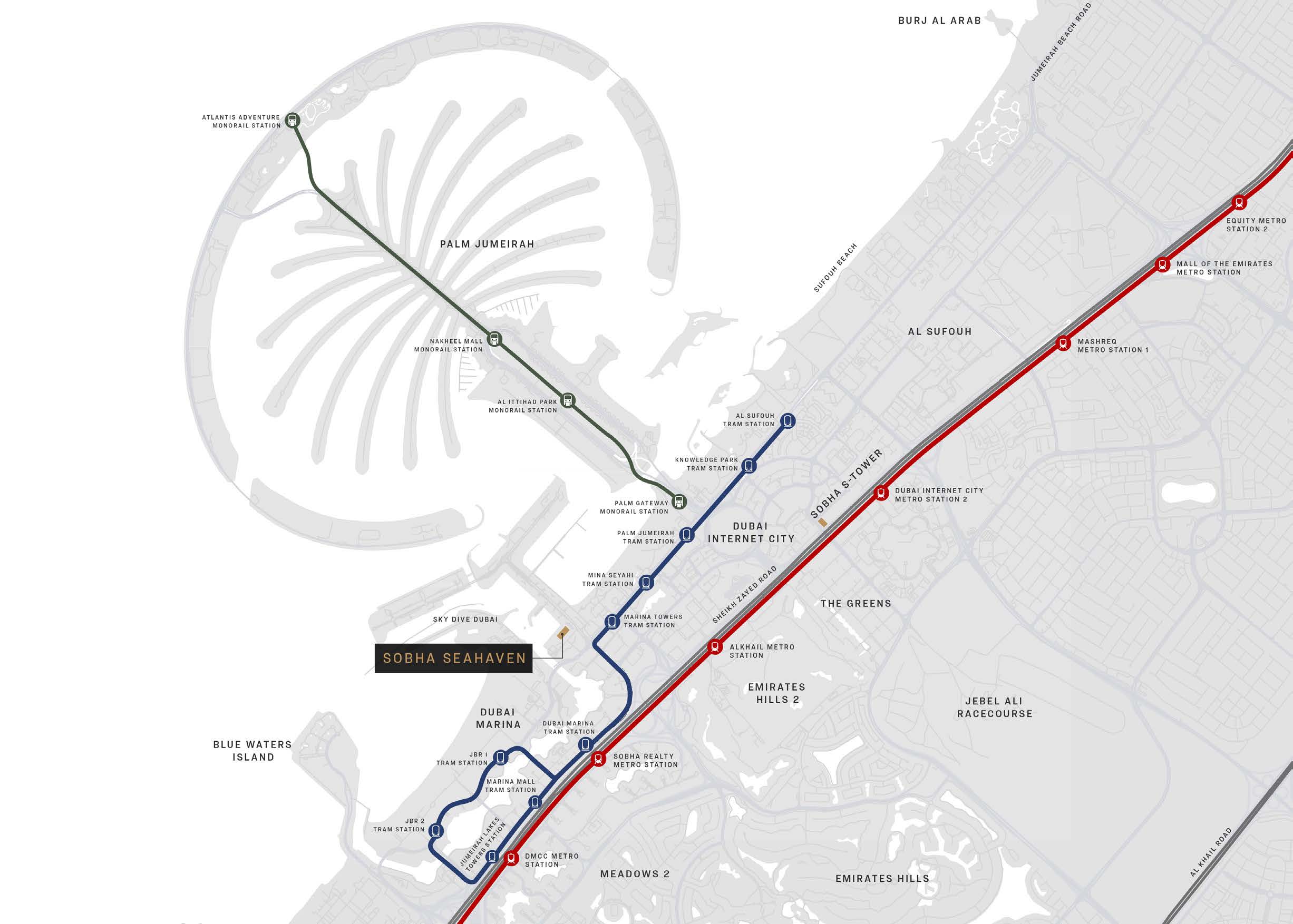 Sobha SeaHaven Tower C befindet sich im exklusiven Dubai Harbour, einem der modernsten und hochwertigsten Waterfront-Distrikte Dubais. Die Lage zwischen Dubai Marina, Palm Jumeirah und JBR zählt zu den gefragtesten Wohn- und Investment-Adressen der Stadt. Durch die unmittelbare Nähe zur Sheikh Zayed Road ist der Tower hervorragend angebunden und ermöglicht schnelle Fahrzeiten zu allen wichtigen Hotspots.